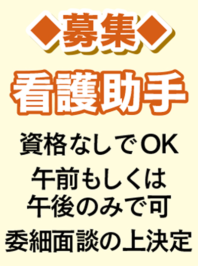 今回同医院を頼りに訪れる患者さんに行き届いた対応を図るため、看護の助手をしてくれる人材を募集。診察の際に患者さんの手を引いたり、体を支えるなどのサポートや看護師のアシスト等、専門的な業務はなく、資格もなくてOK。また午前または午後のみなので働きやすい。まずは気軽にお電話でお問合せを。