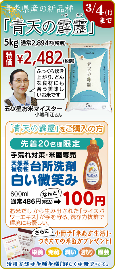 米だけから生み出されたライスパワーエキス配合の天然系植物系台所洗剤「白い微笑み」(通常税込486円)が青天の霹靂を購入すると大特価の100円に。