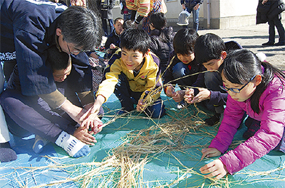 「わらをねじるのって難しい」「途中で切れちゃった」――。下布田小学校(多摩区)で先月行われた、民技会によるわら細工づくりの基本「縄ない」の体験授業。わらを横づちでたたき柔らかくした後、両手をこすり合わせるようにねじりながら絡ませ、1本の縄をなう。会員から直接手ほどきをうけた磯谷亜瑠(あんり)君(11)は「楽しいけど難しい。昔の人は大変だなと思った」と感想を口にした。同校で3年前から続く活動だ。
