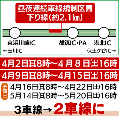 NEXCO東日本・京浜管理事務所では、第三京浜道路の京浜川崎IC〜都筑IC間で橋りょう補修工事を行うため、4月2日(日)8時〜8日(土)16時までと9日(日)8時〜15日(土)16時まで、下り線で昼夜連続の車線規制を実施する。
