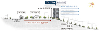 松野尾/まずは「急行停車駅」の駅近物件という点。鷺沼駅から徒歩3分圏内にマンションが誕生するのは13年ぶりです。駅に降りてすぐにスーパーなどの複合商業施設があり、帰り道の間で生活必需品が全て揃います。また沿線ではかなり珍しい「駅から平坦アプローチ」にも関わらず、南傾斜が始まる高台の最前列=下記図=に位置しているため、開放感も抜群です。