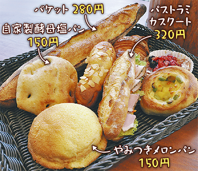一番人気は「やみつきメロンパン」。外はサクサク、中はふわふわ。引き立つ甘さがたまらない。同店用の新メニュー「自家製酵母塩パン」は天然酵母と国産小麦を使った、もちもちした食感が評判だ。同店の松尾英樹代表のおすすめは「バケット」。薄皮で、本場フランスよりも柔らかく、日本人好みに仕上げた。