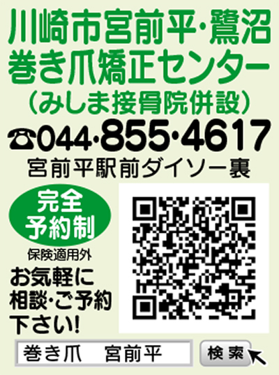 川崎市宮前平・鷺沼巻き爪矯正センター(みしま接骨院併設)
