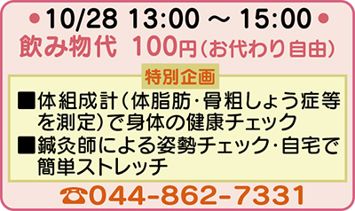 さらに、お隣の「宮前まちの整骨院」の鍼灸師を招いた姿勢チェックもある。「ご近所の皆様の憩いの場になれば。お菓子も用意しております。お気軽にお立ち寄りください」と担当者。