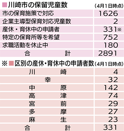 川崎市の前回集計ではこの新定義は適用されておらず、申請をしたものの、保育所を利用していない「保留児童」は2891人だった。そのうち、「産休・育休中の申請者」は331人で、このうち何人が新たに待機児童として集計されるのかがポイントとなる。