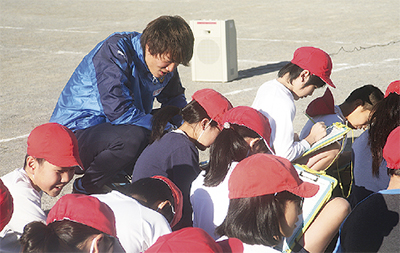 今回は、ボールを蹴ってスピードを計測。時速・分速・秒速などを計算し、動物の走るスピードと比べる問題や、選手と児童が走り、選手と同時にゴールするには各自何m前からスタートすればいいかを計算し確かめる問題にチャレンジした。 計算に悪戦苦闘する児童に選手らがアドバイス。楽しく集中した授業となった。