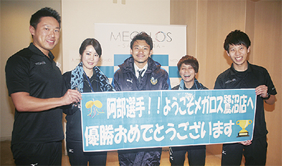 昨シーズン念願のリーグ初優勝を達成したフロンターレ。各店舗で「優勝おめでとう」「今年も頼むよ」などと声をかけられた阿部選手は、「多くの方からあたたかい声援をいただき、一層やろうという気持ちになりました。今年はACLを含め全タイトルがほしい」と力強く語った。