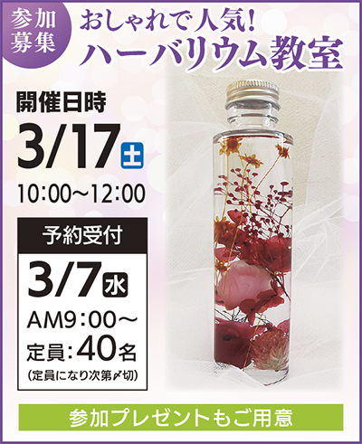 ハーバリウムとは、植物標本という意味。本物の植物を特殊な液体に浸し、ボトルに入れたもの。「おしゃれでインスタ映えする」と人気が高まっているアイテムだ。講師を務めるセレモニアグループ生花部スタッフは「初めての方でもお気軽にご参加ください」と呼び掛けている。