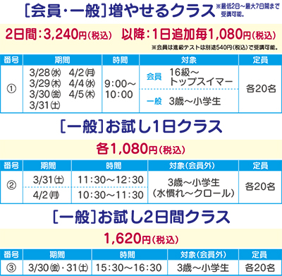 開催日の中から最低2日〜最大7日間まで「選べるクラス」や、まずは水に慣れるところからという「お試し1日」、続けられそうか見極めたいという「お試し2日」の各クラス等、自分に合ったクラスを選べる。