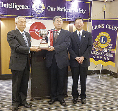 川崎富士見ライオンズクラブ(井田光政会長)は5月2日、ホテルケイエスピーで開いた例会で宮前消防団(杉田正文団長)に操法大会のための優勝カップを寄贈した。