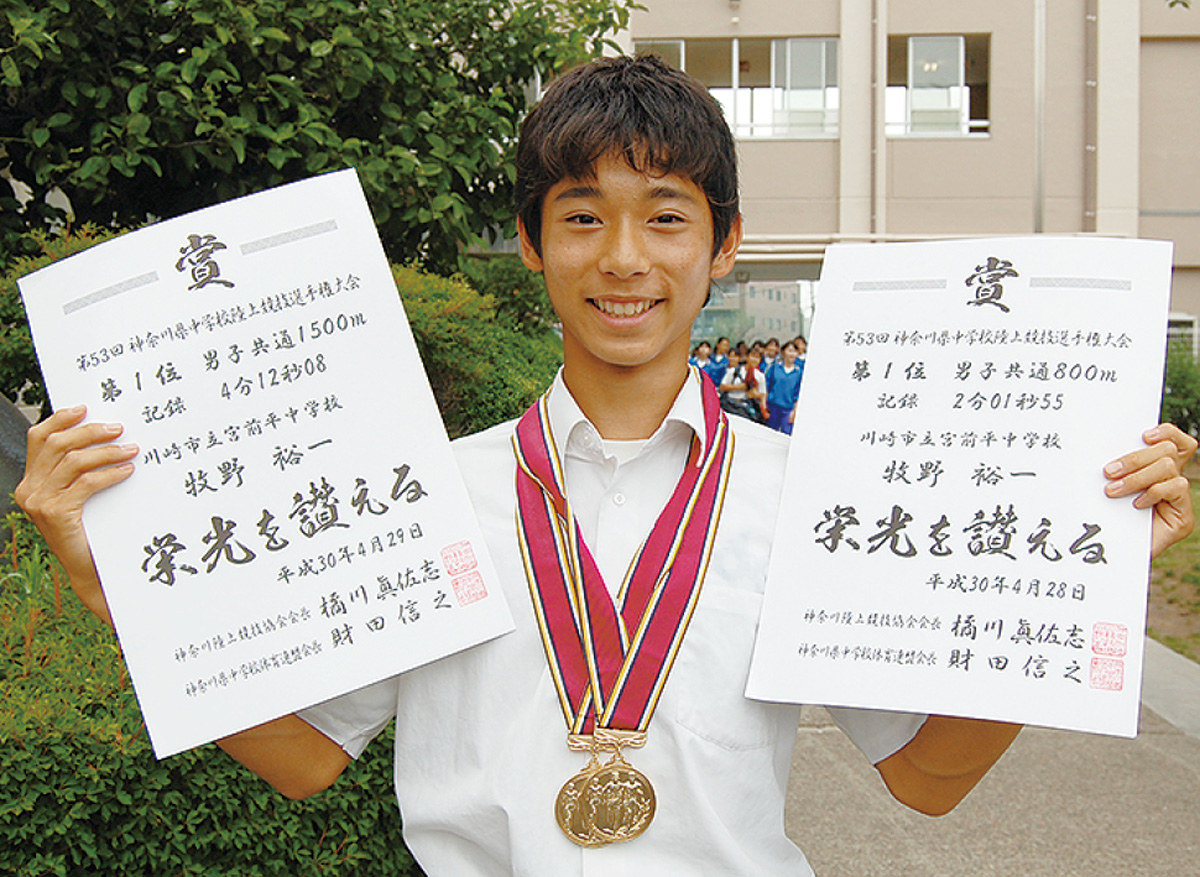 宮前平中陸上部は歴代、全国レベルの選手を輩出している。5年前に同大会で同じく2冠を達成した渡部侑輝君(明治大学)や、青山学院大学に所属する神林勇太君もOB。2人は牧野君の目標だ。