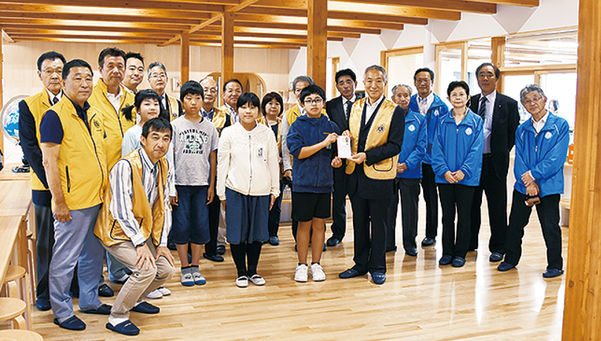 17日の贈呈式にはクラブメンバー11人が出席。同小の生徒委員長に資金を手渡した。井田会長は「新築の校舎で活発に活動する小学生に接し、1日も早い地域のコミュニティの復活を願わずにはいられない」と話した。