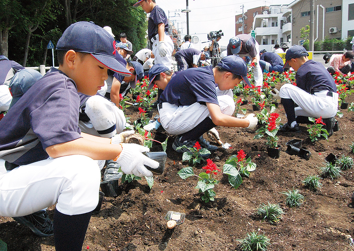 鷺沼町会ガーデニングクラブによる花植えが2日に行われた。町会会員や交通安全母の会、少年野球チーム「鷺沼ヤングホークス」のメンバーら約50人が参加し、サルビア500株ほか、ローズマリー、クローバー、リュウノヒゲなどを植えた。