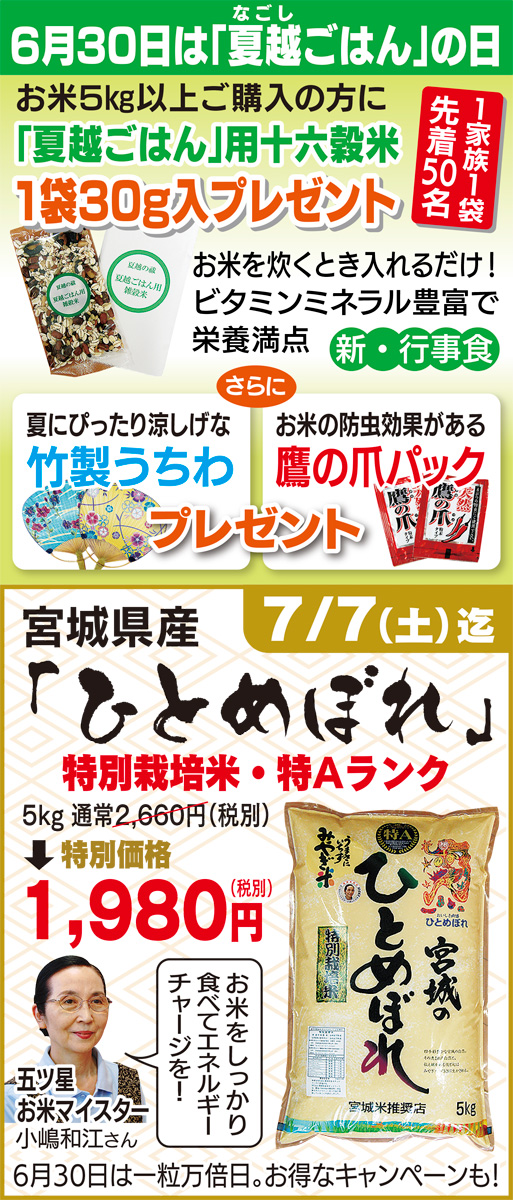 さらに、夏越ごはん用の十六穀米をプレゼント(1袋30g)。お米を普段通り研ぎ水を入れた後、十六穀米を加えて炊くだけなので簡単(2、3合に1袋)。くせがなく食べやすい上、栄養満点なのも嬉しい。「6月30日は夏越ごはんを食べて、暑い夏を元気に乗り越えましょう」と小嶋さん。