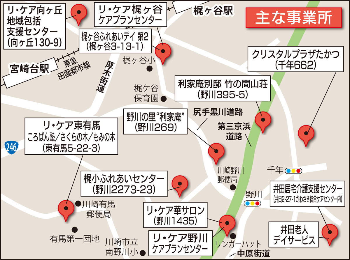 在宅介護対象者を明るい気持ちにし、家族の負担を和らげる介護を目指す「リ・ケア福祉グループ」。2000年に創立。現在、宮前区をはじめ、高津区、中原区、多摩区などで、一般型デイサービスのほか、介護予防型デイサービス(介護保険適用)、川崎市委託介護予防事業(介護保険適応外)、物忘れ(認知症)対応型デイサービス、地域包括支援センター、居宅介護支援事業所を運営する。