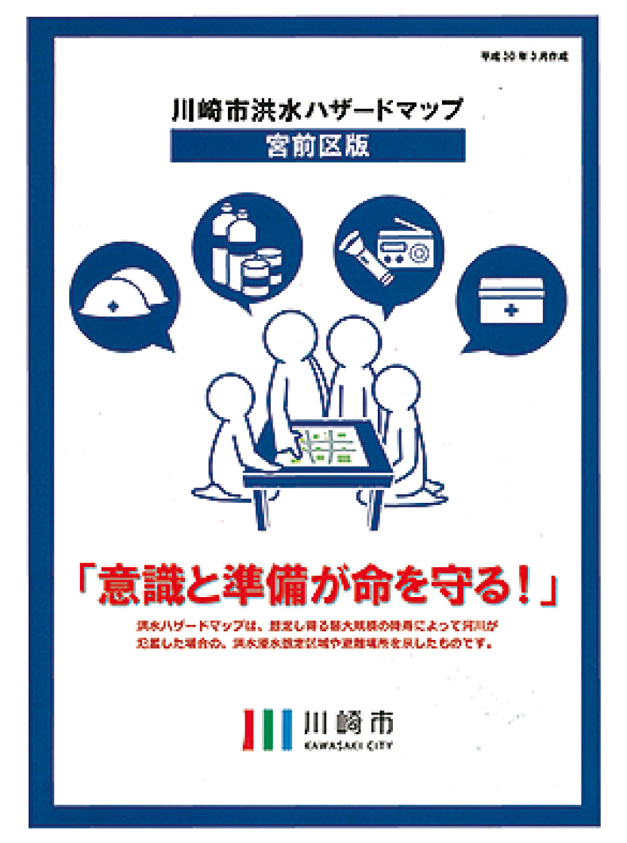 川崎市は今年3月、宮前区ほかの洪水ハザードマップ(=写真)を14年ぶりに改定した。宮前区は多摩川水系と鶴見川水系の洪水区域などを示しており、両水系の河川が氾濫した際は河川沿いの地域に浸水被害が及ぶと想定。家屋倒壊を想定する区域も示されている。