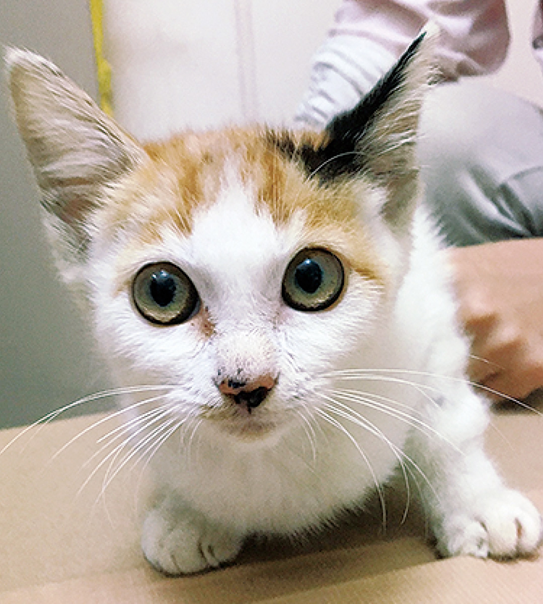 同病院によると、生後約1カ月の三毛猫のメスで、大人しく人懐っこい性格とのこと。