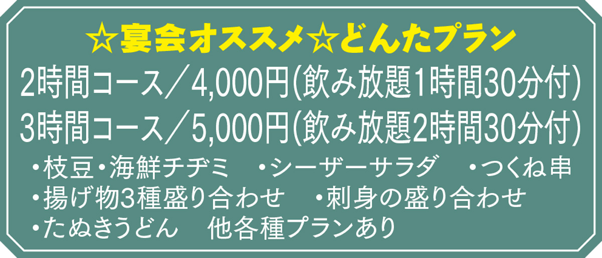 注文を受けてから揚げるサクサクの天ぷらと、関西風のオリジナルだしが大人気のどんたのうどん。そのうどんを締めに堪能でき、座敷でゆったりの宴会プランも豊富。店内に掲示されてる鉄道関係の掲示や写真も必見!