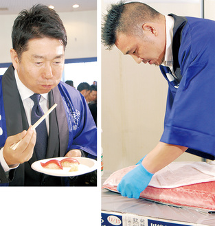 同商品のマグロを試食した福田紀彦市長は「食感は滑らかで熟(な)れている感じ。臭みなく香りは芳醇。全く養殖とは思えない」と感想を述べた。