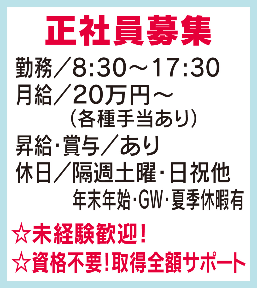 「有限会社利根川防災通信」では正社員を募集中。コンセント工事や照明器具の設置など、生活に身近なものから、消防、防犯設備のメンテナンスなどをおこなう同社。一見むずかしい仕事のようだが、同社は未経験者を積極採用。資格取得も全額サポートしてくれ、先輩社員が丁寧に仕事を教えてくれるので安心。現在のスタッフも入社後に資格を取り、同社で育った人材も多い。