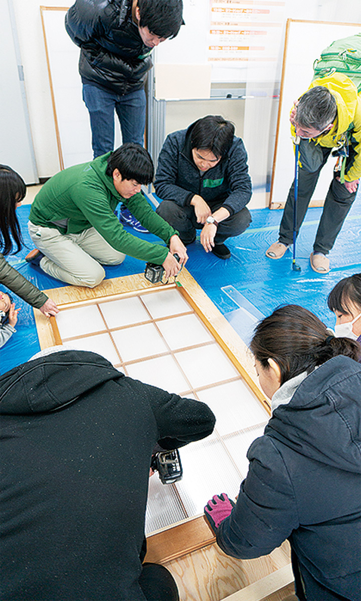 ワークショップには、20から60代の18人が参加。初日に座学を受け、2日目に区内の(株)サトーホームと高橋工務店の指導の下、改修工事を実践した。