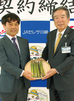 セレサ川崎農業協同組合(原修一代表理事組合長)=JAセレサ=は、市内のアスパラガス生産、普及の拡大に向けて、明治大学と委託研究契約を結び、先月28日に同JA本店で締結式を開いた。原組合長と同大の元木悟准教授が出席した。