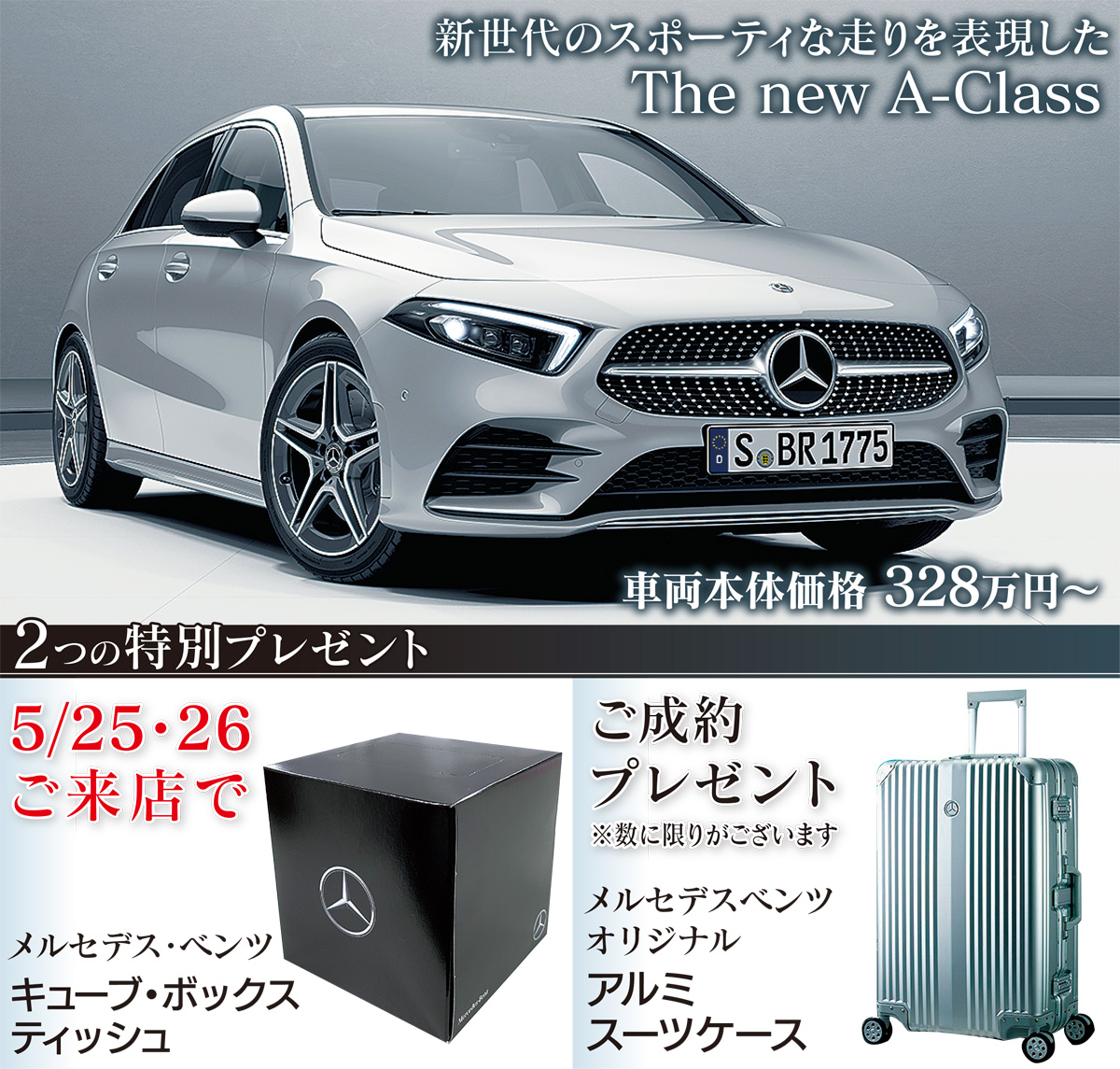フェア2日間は新型Aクラスの試乗はもちろん、来店特典も用意。成約特典のオリジナル「アルミスーツケース」も魅力だ。