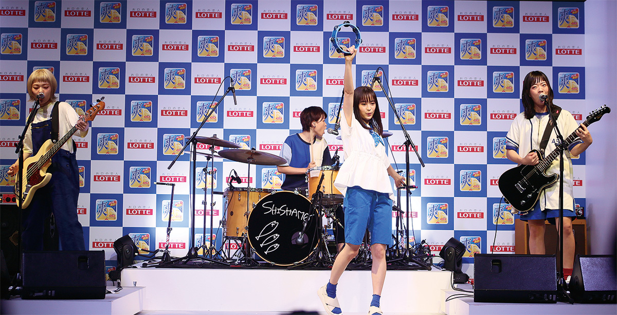 ロッテのアイスクリーム「爽」の新CM撮影が等々力陸上競技場で先月行われ、6月12日に放映を開始。CM発表会が10日に都内で開かれ、出演した川崎出身のロックバンド「SHISHAMO」と女優の広瀬すずさん(21)が、CMで演奏した楽曲「OH!」を披露した。