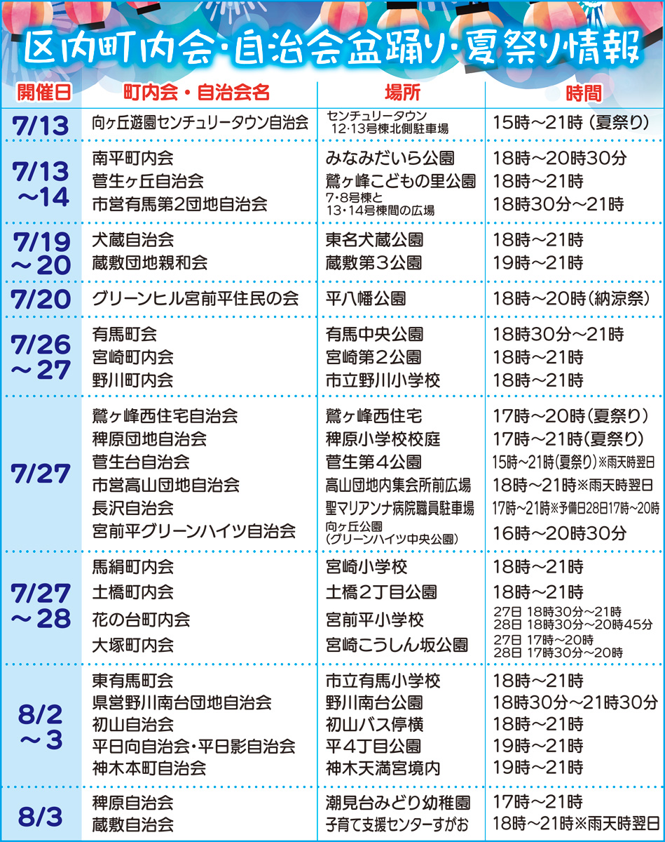 宮前区内の各町内会・自治会主催の盆踊り・夏祭りが今年も開催される。