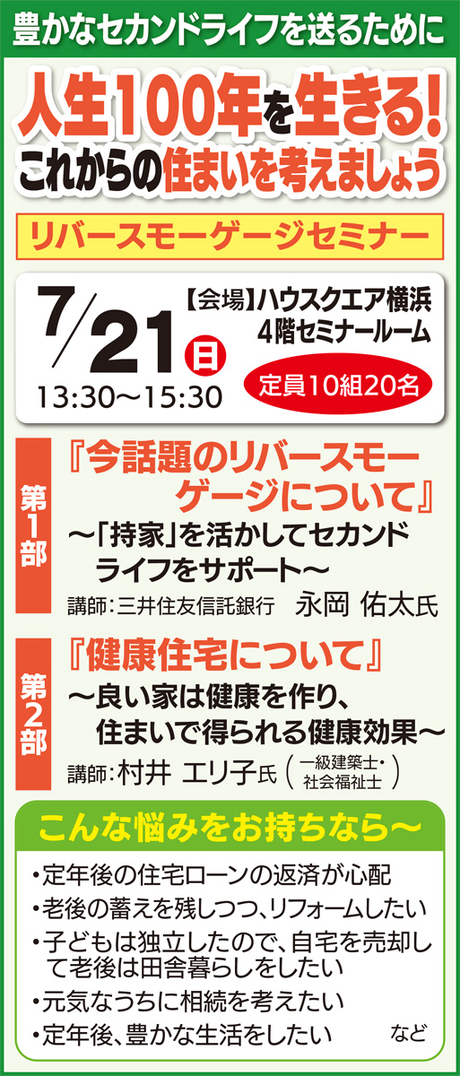 「人生100年時代」に老後の生活資金の心配を解消し、自宅で安心して暮らし続けていくための方法を学ぶ無料セミナーが7月21日(日)、ハウスクエア横浜で行われる。積水ハウス(株)の主催。