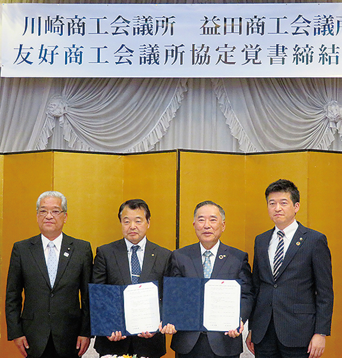両市は平成2003年、川崎市立商業高校(現・幸高校)の創立50周年事業で益田市の郷土芸能が演舞されたことを契機に交流が始まった。2013年には両市が文化やスポーツ分野での交流に関する覚書を締結。昨年は益田市の中学生の修学旅行生が川崎市内の工場にものづくり体験を行っている。両商議所の交流は5年前から行われ、さらに経済効果のある交流につなげたいとの思いから友好締結した。