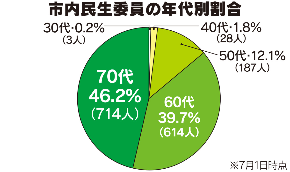 市内の委員数は7月1日時点で定数1799人に対し、欠員253人。高齢化が進み、70代の担い手が4割以上を占める。市は前回改選時、再任の年齢要件を75歳未満から例外的に77歳未満に引き上げ、人員確保に努めたが、今年12月の改選で前回再任された96人が77歳以上となるため任期満了で退任する。