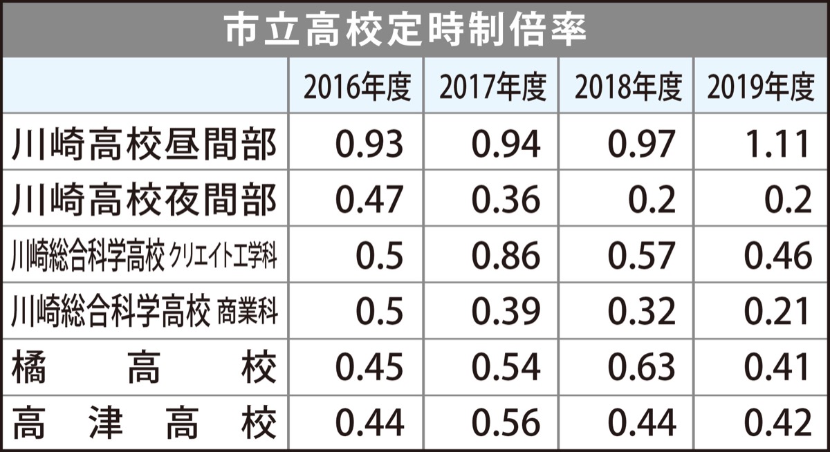神奈川県内の公私立高校は2006年から、希望者の多い全日制への進学実績を高めようと取り組んできた。その影響もあり、市内定時制の入試倍率は年々低下。川崎高校(川崎区)、橘高校(中原区)、川崎総合科学高校(幸区)、高津高校(高津区)ともに過去4年間定員割れが続いている。これを受け、川崎高校は夜間部の募集を停止。高津高校も募集枠を3クラスから2クラスに縮小する。同じ定時制でも、川崎高校に設置されている昼間部の入学希望者は近年増加傾向にあった。今年度の倍率は1・1倍と、初めて受検者数が定員をこえたため、現在2クラスの昼間部の募集を4クラスに拡大する。