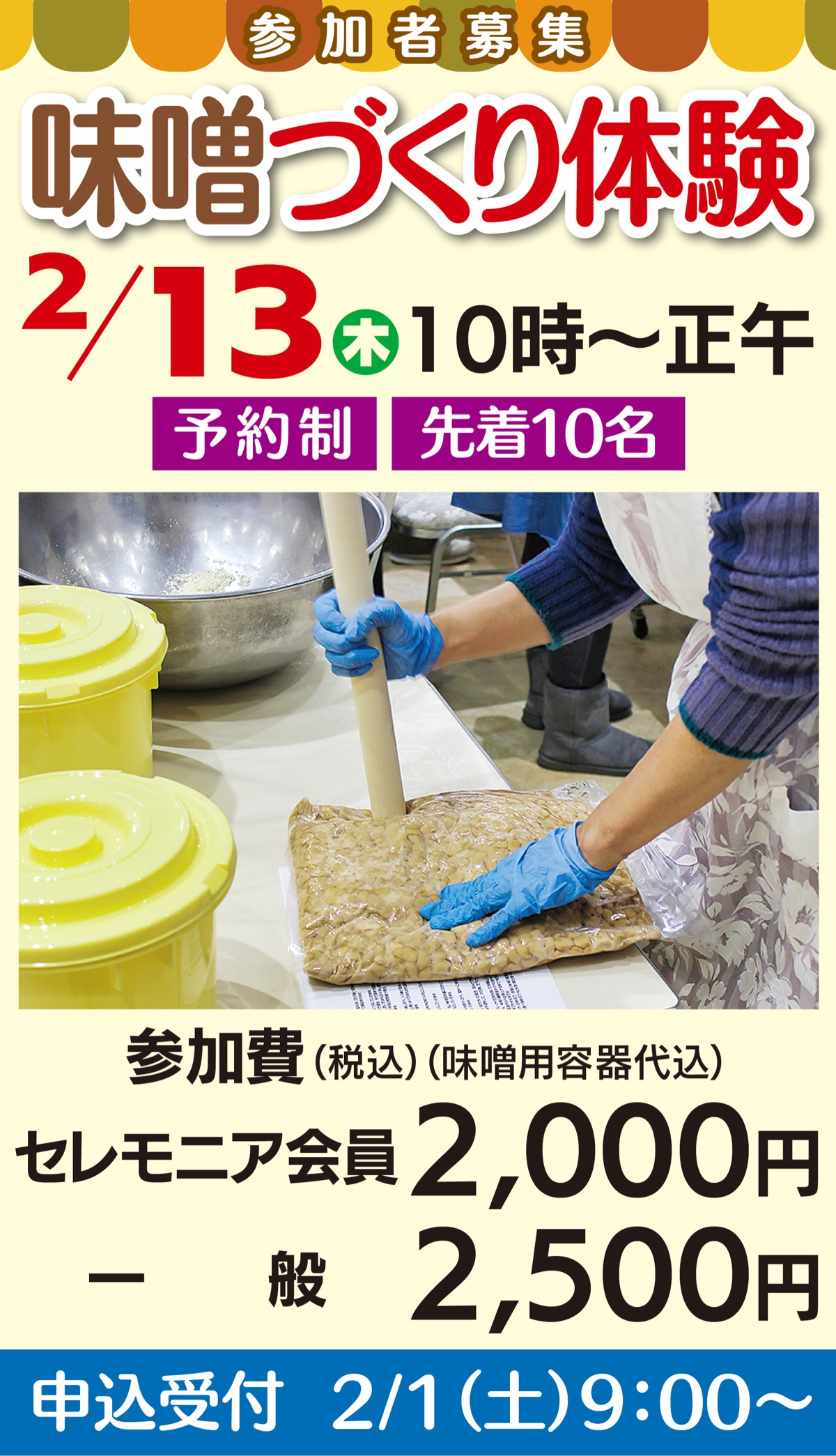 申込受付は明日2月1日(土)から。電話で受け付ける(午前9時〜午後5時)。参加費は味噌用容器込みで一般2500円、セレモニア会員2000円。定員先着10人。人気が予想されるので早めに申込みを。