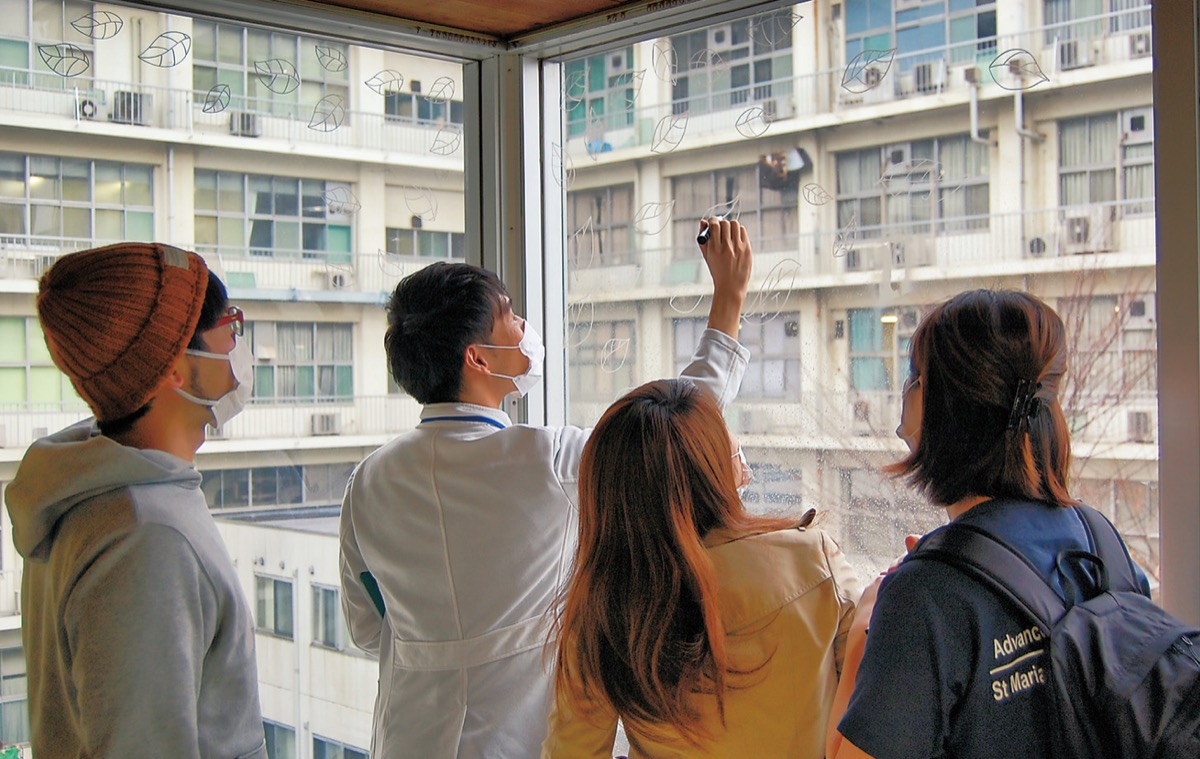 聖マリアンナ医科大学病院で、患者や職員を癒す「ホスピタルアート」の制作が進んでいる。3月2日には病院職員も参加し、窓にイラストを描きこんだ。3月中旬完成予定。看護部の本舘教子さんは「明るい雰囲気が患者様や職員の活力につながれば」と話す。