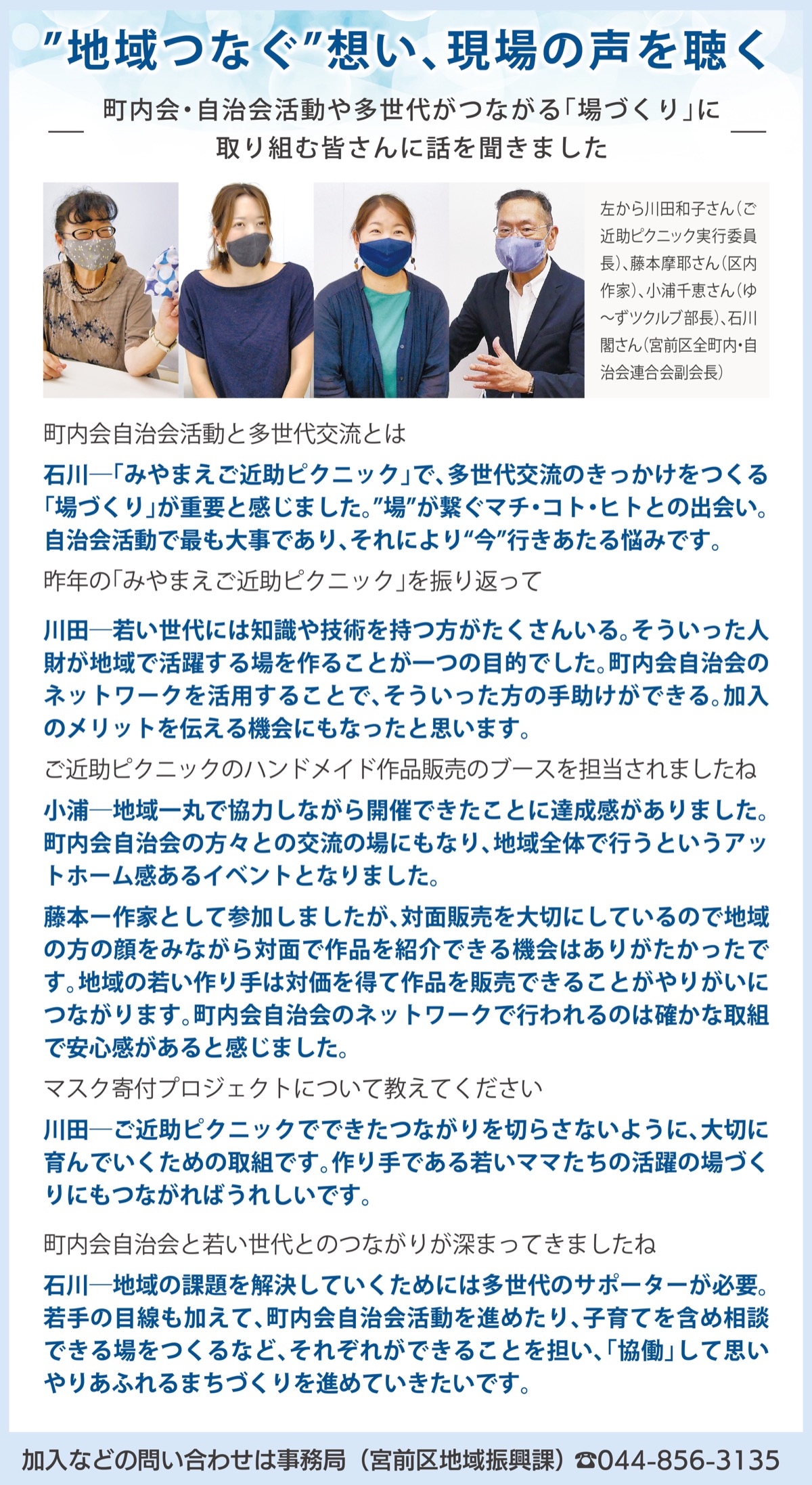 宮前区全町内・自治会連合会が中心となり、住民らが連携して昨年初開催した多世代交流イベント「みやまえご近助ピクニック」。今年は新型コロナ感染拡大防止のため中止を決断。実行委員会は「いまだからこそできることを」と、地域貢献として「手づくりマスク寄付プロジェクト」を進めている。