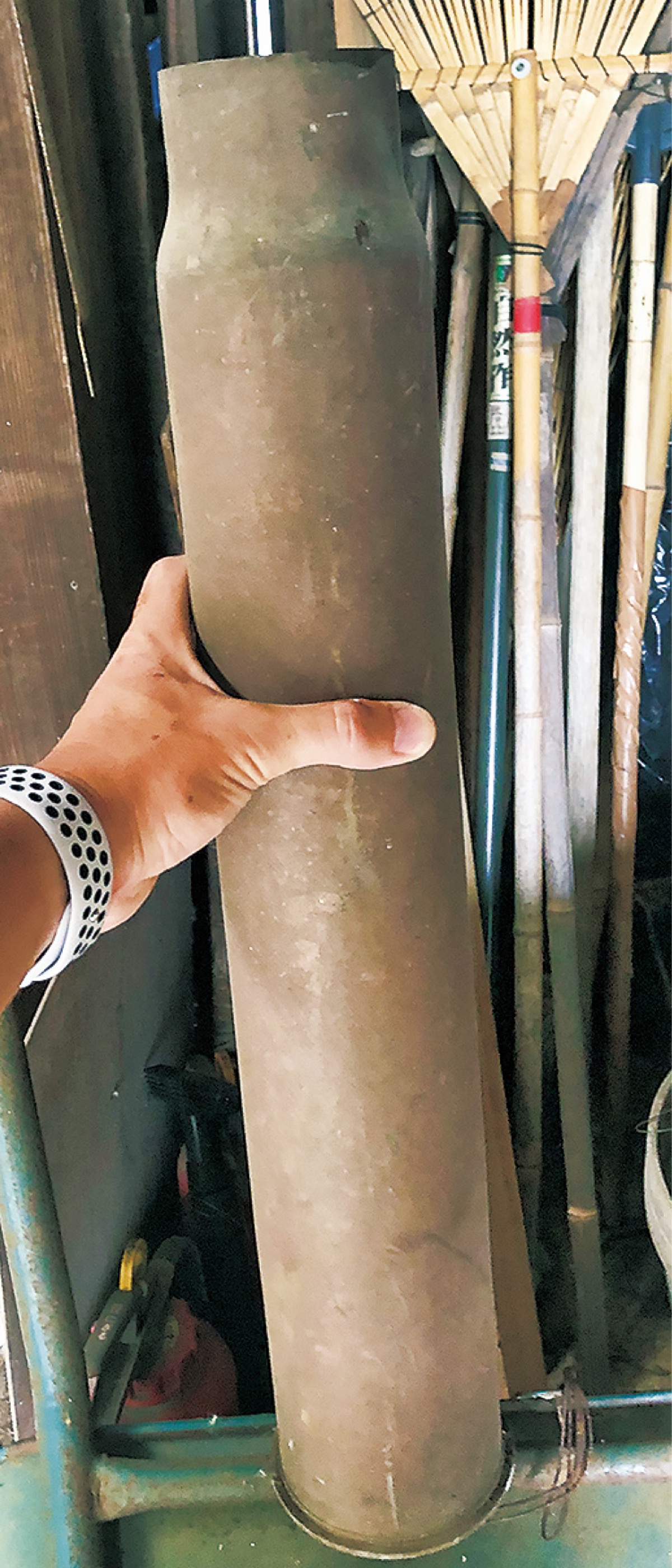 戦中、B29が焼夷弾を落とすのが自宅から見えた。「落とすときに、少し機体が傾くんだ」。港北区の方に高射砲があり、弾が近くの竹林に落ちたことも。62部隊には模擬砲弾があり、薬莢=写真左=のみだが、凄い大きさが見て取れる。