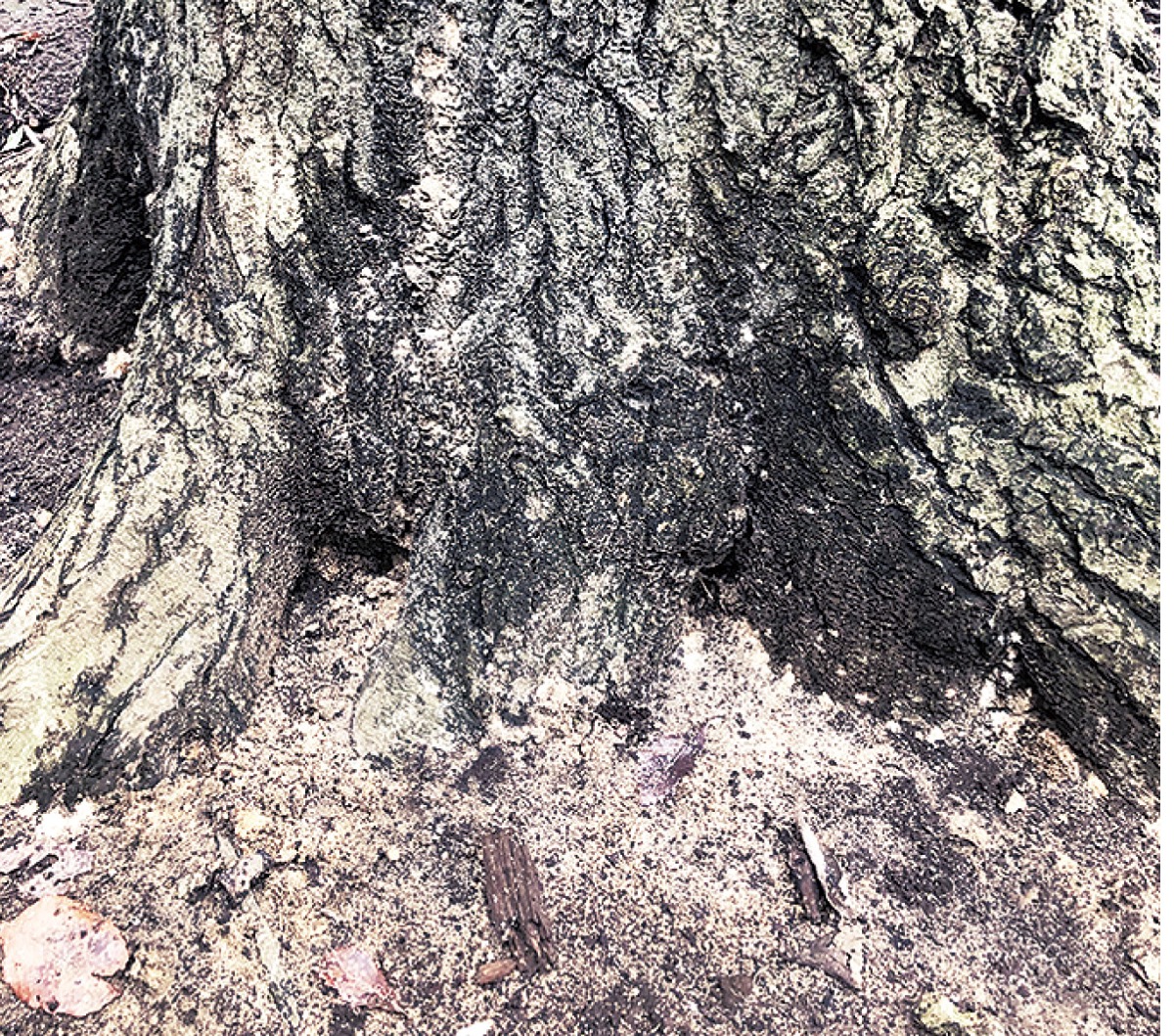 県森林協会によると、カシナガは翌年には成虫が羽化し被害が拡大するため、早期対応が重要とされる。感染樹木は紅葉シーズンを前に赤く枯れ、根元には虫が穴を空けた際に出るフラスとよばれる木くずが散乱しているのが特徴だ。