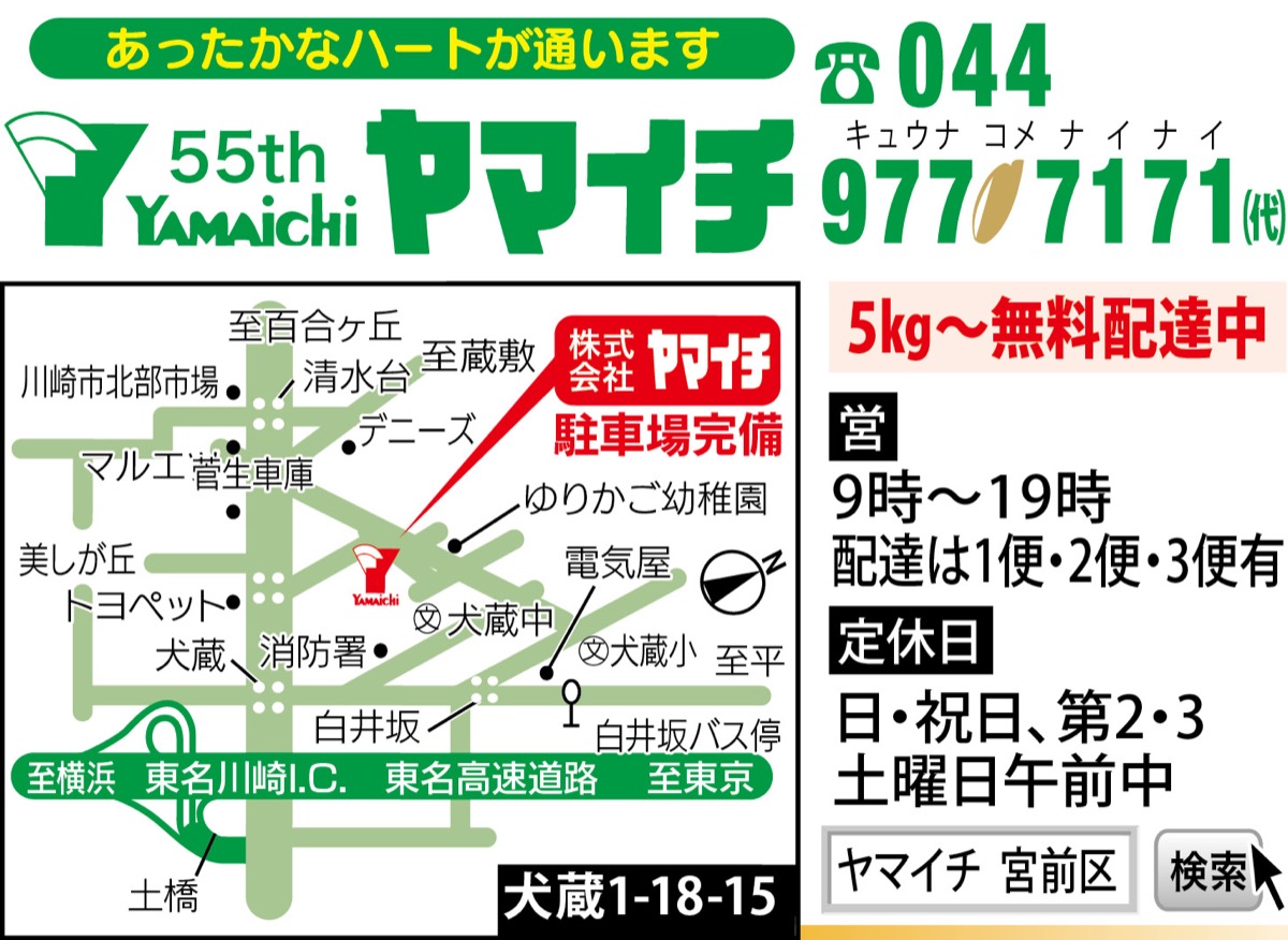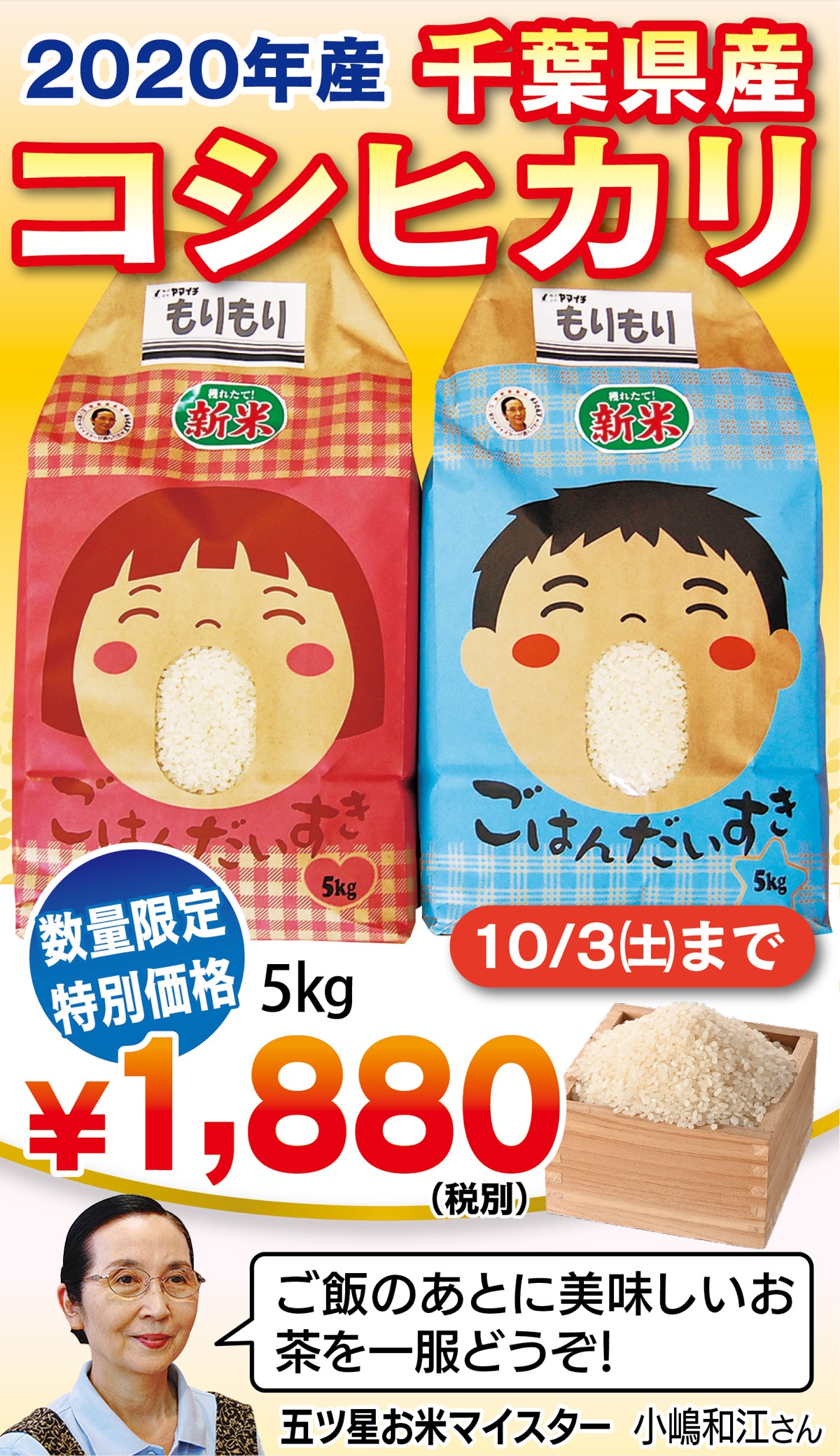 今年の新米、千葉県産「コシヒカリ」が人気だ。区内犬蔵のお米専門店「ヤマイチ」の五ツ星お米マイスター・小嶋和江さんが厳選した一等米。「ねばりが良く、つやつやしてほんのり甘味がある。今年も最高の食感。自信を持ってお薦めしています」と太鼓判を押す。「子どもたちにも美味しいお米を”もりもり”食べてすくすく育ってほしい」との思いから米袋も一新。可愛らしい紙袋のデザインとともに、新米の美味しさを楽しんで。各種新米も続々入荷中。川崎じもと応援券も利用可能だ。
