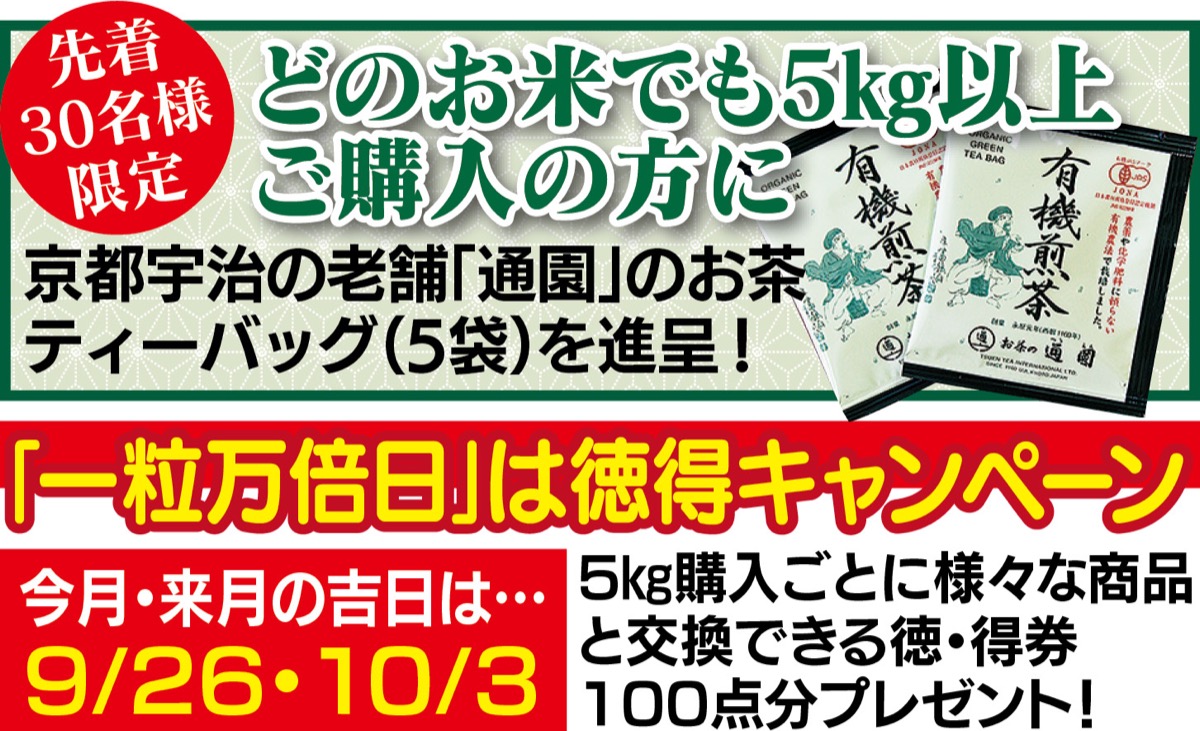 同店では、好評につき「新米フェア第2弾」を開催。どのお米でも、5kg以上購入の方に京都宇治の茶屋「通園」のお茶ティーバッグ(5袋)をプレゼント。