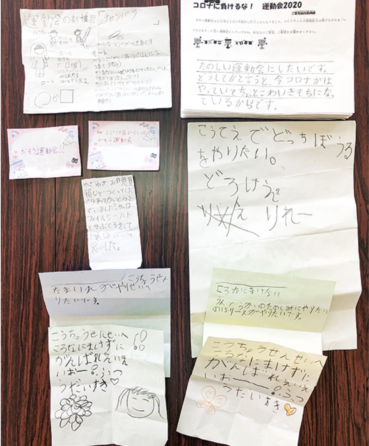 意見箱には10月1日時点で約30の意見書が寄せられた。専用用紙に「リレーはやりたい」「たのしいうんどうかいにしたい」と書かれたものや、コロナ禍でも行えるよう考えた種目の代案、保護者から開催に向けた応援の声、1年生から「ころなにまけるな!えいえいおー」と折り紙に書かれたものなどもあった。