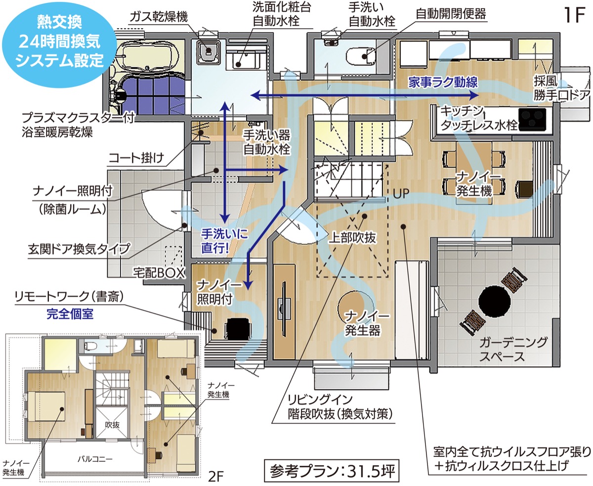 新型コロナ対策では、主に「3密回避」「衛生管理」「健康管理」の3つの対策が求められています。新生活様式に配慮したモデルプラン(65万円/坪)では、玄関横に「除菌ルーム」を配置するなど、外部からウイルスを持ち込ませない設計を提案しています。独立した「書斎コーナー」を設け、リモートワーク環境も整えました。換気対策としてリビング階段と吹き抜けを設けたほか、「ナノイー空気清浄機」や「熱交換型24時間換気システム」「タッチレス自動水栓」「抗菌コーティング」など設備面も大変充実しております。