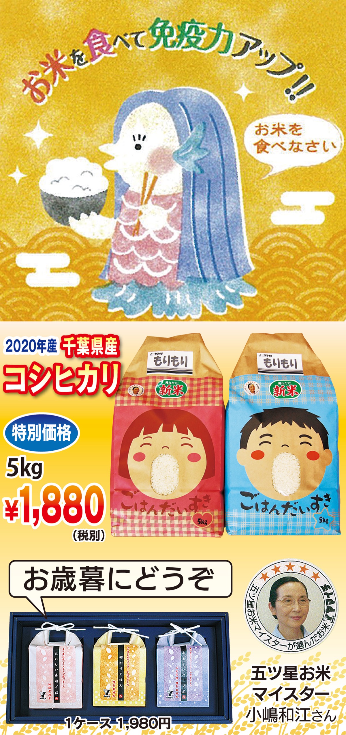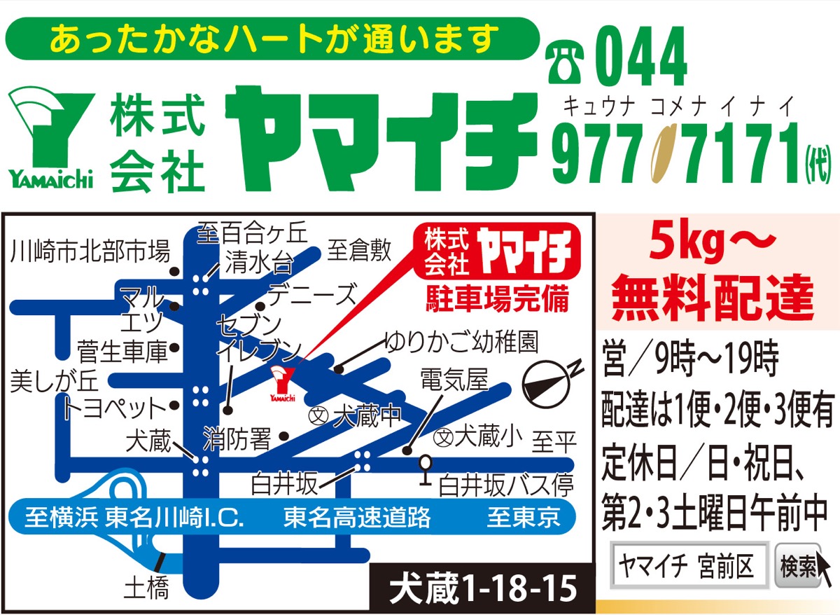 なお前回紹介した五ツ星お米マイスター小嶋和江さんが厳選した新米が大好評!子どもたちに美味しいお米をもりもり食べてすくすく育ってほしいと、米袋も新調された。「自信を持ってお薦めしています」と小嶋さん。お歳暮には特別栽培米2合入り3点セットをご用意。卵かけごはん用の新潟産コシヒカリ、おいしい寿司ごはん用山形県産つや姫、あまーいハーブ米島根県産きぬむすめのバラエティ。喜ばれること請け合い。川崎じもと応援券利用可。まずは気軽に店頭へ。