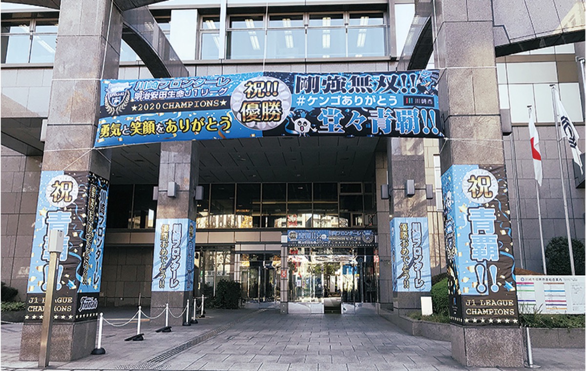 川崎市は11月29日から市役所第3庁舎に横断幕や懸垂幕を掲出。JR川崎駅北口通路には12月5日から「優勝記念ストリート」をつくりあげ、今シーズンの快進撃の軌跡や今シーズン限りでの現役引退を表明した中村憲剛選手の18年間を振り返る写真各30枚を展示する。