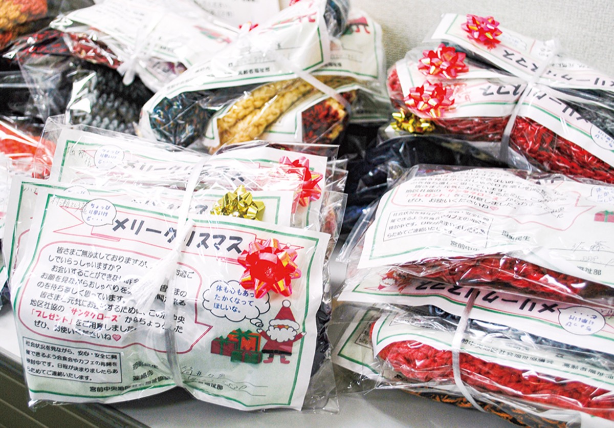 11月に民生委員ら有志が靴下をラッピング。12月6日の会合時に、それぞれの担当エリア分の靴下が配布され、担当者が配りに回った。受け取った高齢者は「暖かくて良いのよ、ありがとう」と、会長宅にお礼を伝えに訪れる人もいたという。
