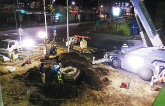 ついに、宮前区地域振興課から「これまで管理が行き届かなかったが、より効果的に見ていただけるようになるはず」という移設の一報が入った。撤去は昨年12月7日の午後10時から翌朝5時にかけて夜間工事として行われた=写真。インター入口1車線を通行止めにし、クレーン車で吊り上げ撤去。業者に一時的に持ち帰り加工され、同22日に尻手黒川道路沿い、向かいのゴルフショップ前の花壇に移設された。