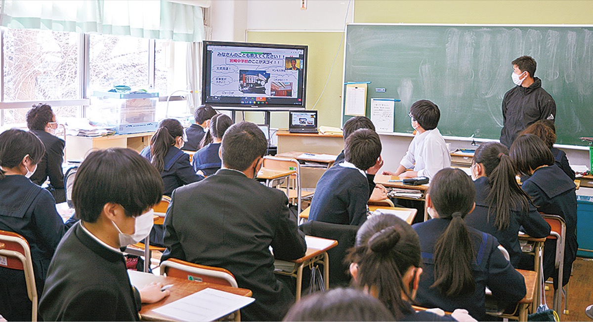 宮崎中学校(榎原真也校長)の3年生289人が2月25日、森永乳業(株)と教室をオンラインでつなぐ「リモート企業訪問学習」を行った。