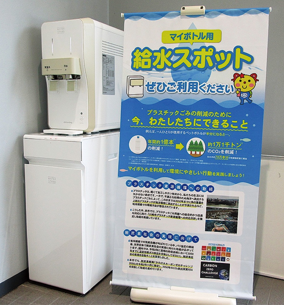 川崎市は3月下旬から、誰でもマイボトルに給水できるウォーターサーバーを市内公共施設に試験的に導入した。計30台を設置し、利用状況などを見ながら増設していく。
