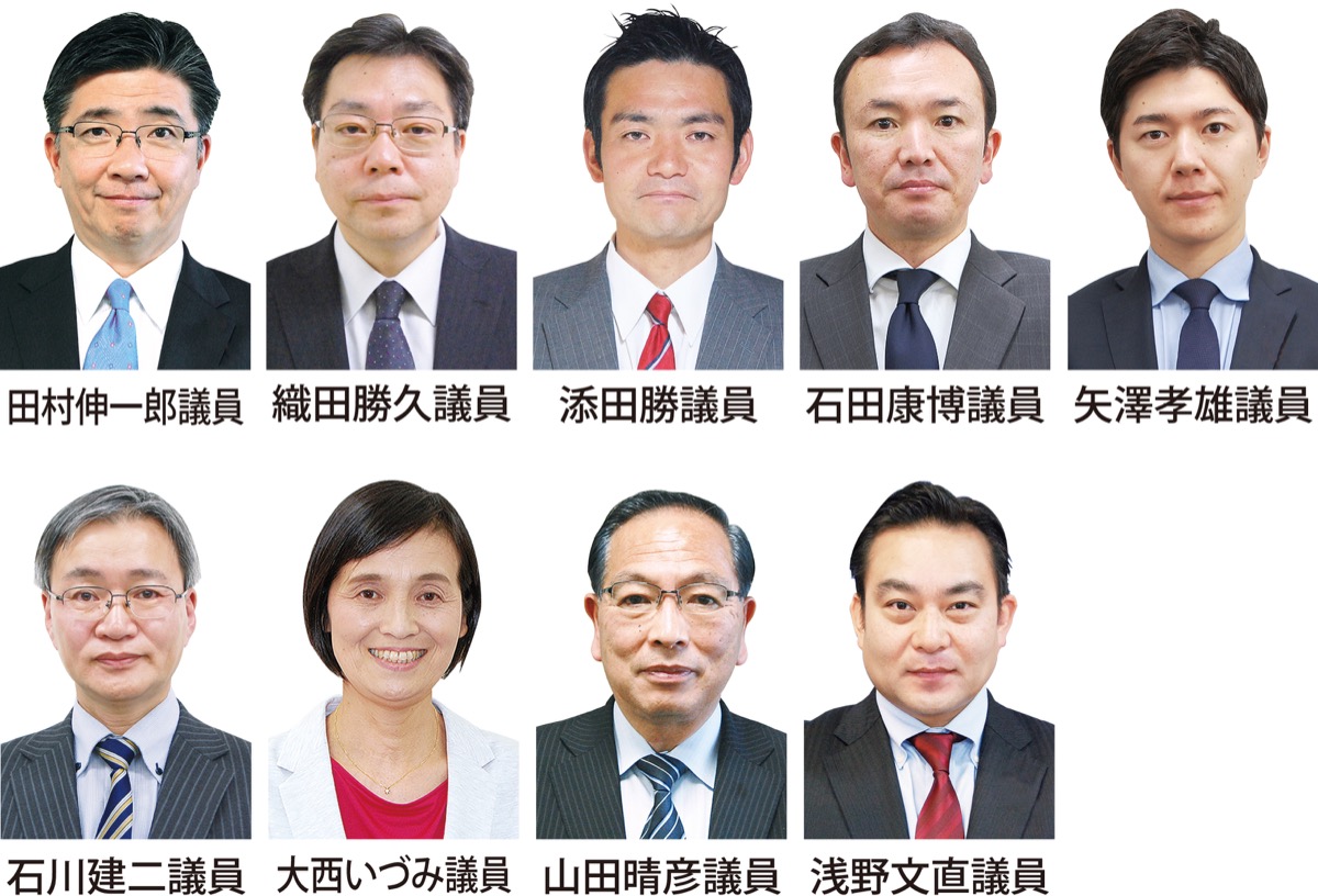 ▽矢澤孝雄(自民)/文教委員会・委員長▽石田康博(自民)/文教委員会▽添田勝(無)/文教委員会▽織田勝久(みらい)/健康福祉委員会▽田村伸一郎(公明)/議会運営委員会▽浅野文直(自民)/健康福祉委員会▽山田晴彦(公明)/総務委員会▽大西いづみ(無)/健康福祉委員会▽石川建二(共産)/まちづくり委員会