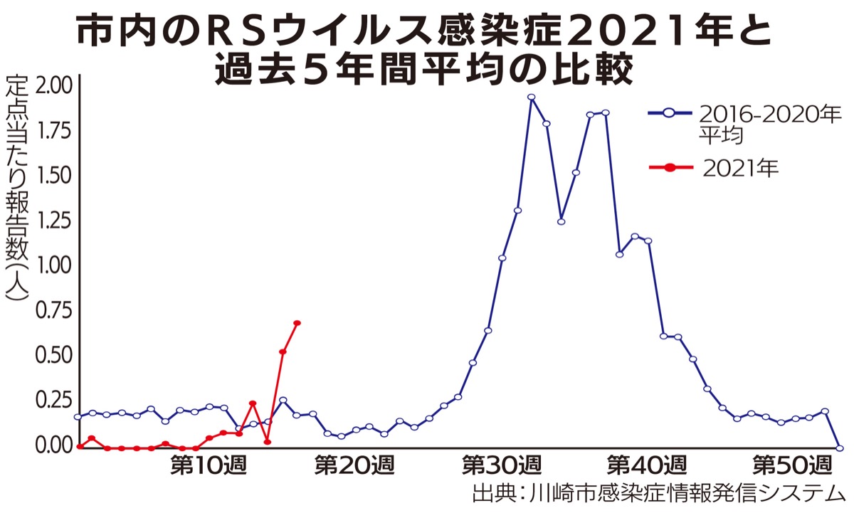 RSウイルスは、ほとんどの人が2歳までに感染し、例年は夏ごろから流行し年末にピークを迎える。市内では今年、3月から徐々に増加。2021年第16週(4月19〜25日)の報告数は24人で、過去5年間の同時期平均は約7人。例年の約3倍で、25日時点で右肩上がりを続けている。時季外れの流行に、市健康福祉局の担当者は「コロナ対策でインフルエンザの患者報告数は激減したが、同じ感染経路のRSウイルスは増えている。原因は今のところ分かっていない」と話す。